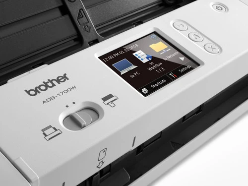 Neem de Brother ADS-1700W scanner makkelijk mee door zijn bescheiden afmetingen. De scanner is even breed als een A4 en slechts de helft zo breed. Neem hem mee in je tas en scan op locatie en onderweg tot 25 pagina’s per minuut automatisch dubbelzijdig. Scan ook ID-kaarten met het ingebouwde ID-kaartslot. Je verstuurt je scantaken draadloos via wifi. En door middel van het touchscreen van 7,1 cm stel je deze scanner gemakkelijk in zonder tussenkomst van een pc. Verder herkent de scanner blanco pagina’s en voorkomt hij automatisch scheefgetrokken papier