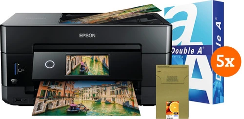 Ga direct aan de slag met de Epson Expression Premium XP-7100 + 1 set extra inkt + 2.500 vellen A4 papier bundel. De Epson Expression Premium XP-7100 is een all-in-one inkjetprinter speciaal om foto’s mee af te drukken. Dankzij de 5 individuele cartridges print je foto’s met een mooi contrast, ook zonder witrand. Met de automatische documentinvoer (ADF) scan je een stapel papier die je makkelijk samenvoegt tot 1 digitaal document. Bewaar het fotopapier en printpapier in twee aparte papierlades. De printer heeft een groot touchscreen, waarmee je foto’s afdrukt zonder dat je je computer nodig hebt. Tot slot gebruik je de XP-7100 ook om kalenders en wenskaarten te maken en print je ook op speciale bedrukbare CD’s en DVD’s.