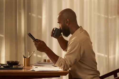 Zet je tablet rechtop met de back cover en sluit je af van achtergrondruis met de Google Pixel Buds oordopjes bij je Google Pixel Tablet.