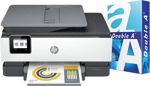 Ontvang een voorraad papier bij je printer met de HP Officejet Pro 8022e + 500 vellen A4 papier bundel. De HP OfficeJet Pro 8022e is een all-in-one inkjet kleurenprinter bedoeld voor een klein of middelgroot kantoor. Door de afdruksnelheid van 20 zwart wit- en 10 kleurenpagina’s per minuut is deze printer zeer geschikt voor een middelgrote kantoorruimte, een kleine kantoorruimte of een thuiskantoor. De printer kan scannen, kopiëren, faxen en is voorzien van een automatische documentinvoer, waardoor je een stapel vellen met één druk op de knop scant of kopieert. Ook print je dubbelzijdig en kopieer je tot 13 pagina’s per minuut. Pas gemakkelijk printerinstellingen aan op het 5,6 cm kleuren touchscreen. Print gemakkelijk draadloos via je smartphone, tablet of via een e-mailtje.