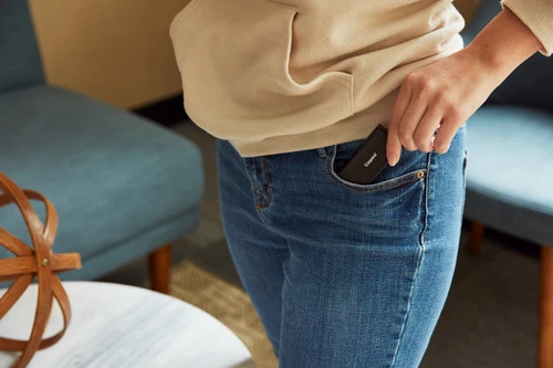 Door het kleine formaat past deze SSD gemakkelijk in je broekzak, jaszak of rugzak.
